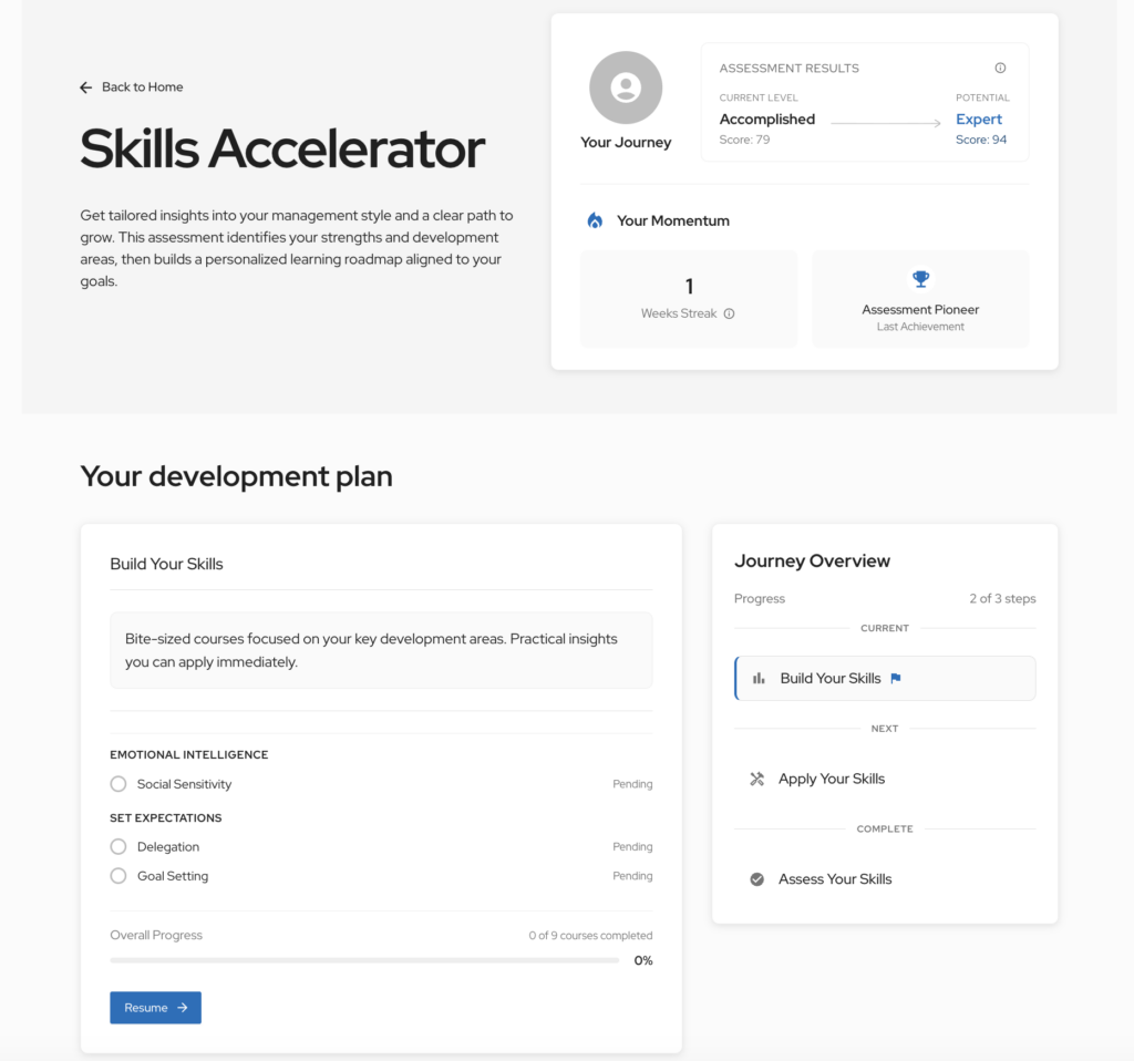 Keep an eye out for new skills practice modules that will soon be added to the Skills Accelerator. These modules will enhance the ‘Apply’ stage of the journey, offering managers more hands‑on ways to practise and strengthen their priority skills as we continue to expand and integrate this capability. They’re short, scenario‑based modules that let managers practise everyday management situations in a safe, realistic way.
